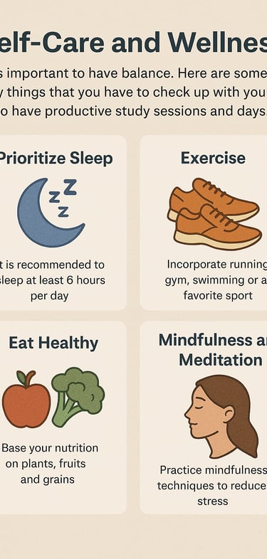 1- Prioritize sleep: it is recommended to sleep at least 6 hours per day, and it's true, that having a good night of sleep even if it is 6 hours, sleep is key for memorizing and remembering your classes and your study sessions.